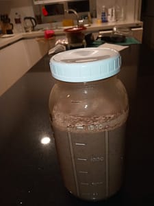 We brewed up several gallons of tea, added sugar, the starter kit, and the cans of kombucha. Then we put it in a sprouted warmer kit ordered from Amazon and wrapped another gallon in an electric blanket. You have to keep the kombucha at about 80 degrees F (26.67 Celsius).